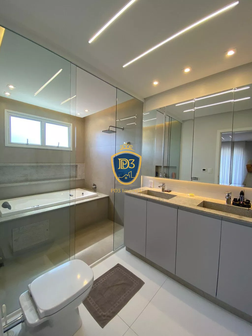 Subindo para o piso superior nos deparamos com 03 quartos, sendo uma suíte Master com amplo banheiro com banheira de hidromassagem com piso aquecido, 01 banheiro social, sala de TV/escritório, varanda ampla nos fundos.