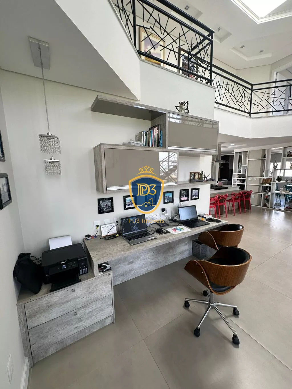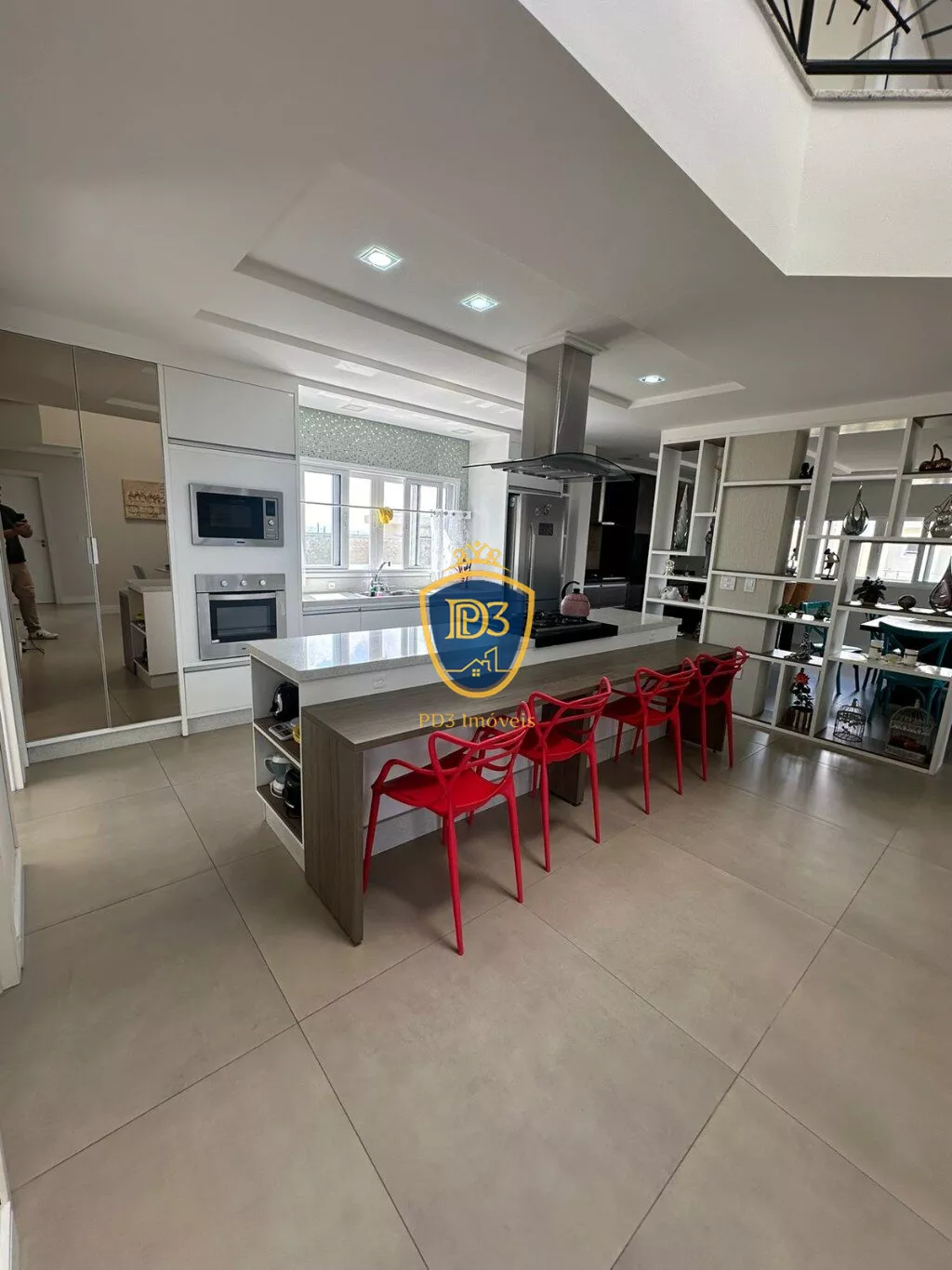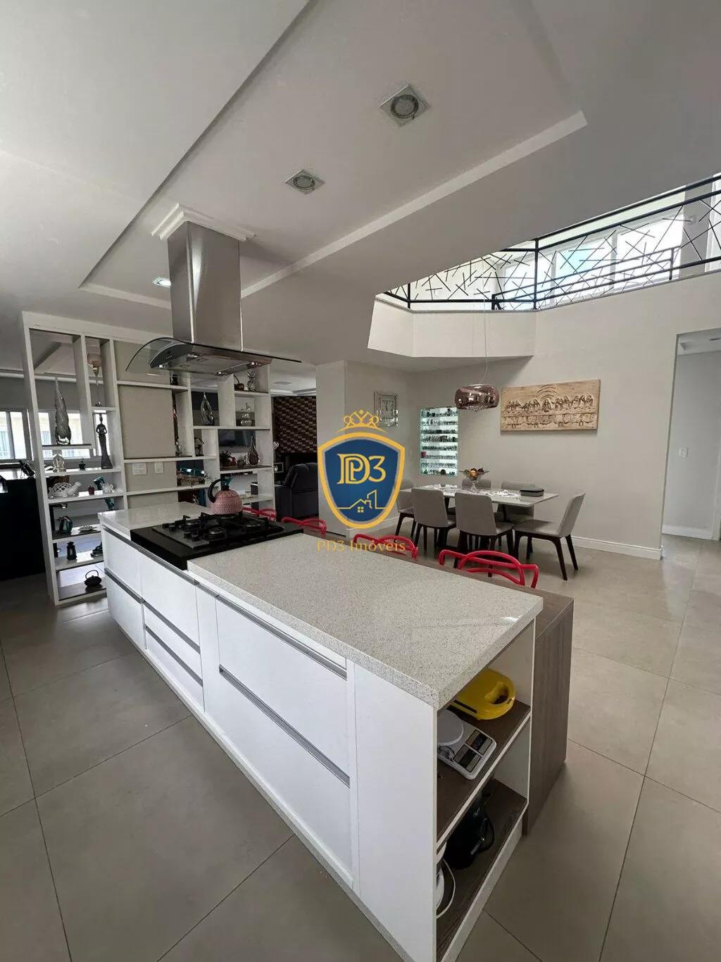 3 suítes com closet, (sendo uma delas máster), Banheiro Social, sala de TV; adega, ateliê, lavabo, ampla cozinha e área Gourmet, despensa, ampla lavanderia.
